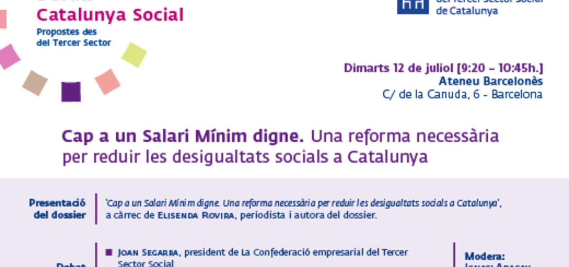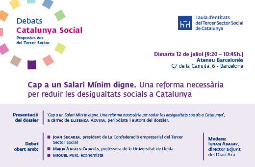 El proper dimarts 12 de juliol a les 9:15h se celebrarà el debat ‘‘Cap a un Salari Mínim digne. Una reforma necessària per reduir les desigualtats socials a Catalunya’. El debat s'emmarca dins del cicle 'Debats Catalunya Social. Propostes des del Tercer Sector'. organitzat per la Taula del Tercer Sector. L'acte tindrà lloc a l'Ateneu Barcelonès (C/ Canuda, 6).
