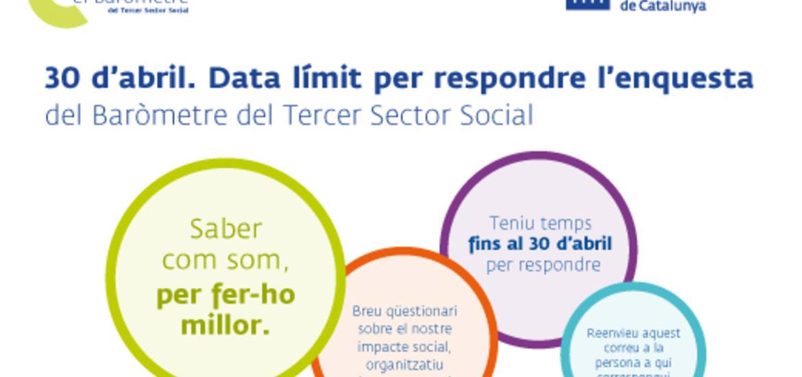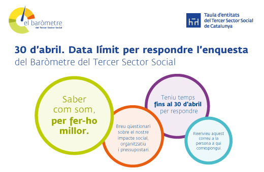 El proper 30 d'abril és la data límit per respondre el qüestionari del Baròmetre del Tercer Sector Social. El Baròmetre és un esforç col·lectiu de les 4.000 entitats socials catalanes que pertanyem a les federacions membres de la Taula del Tercer Sector. Perquè volem conèixer millor quina és la nostra aportació a la societat, el seu abast, i quines són les dificultats i els mitjans que tenim avui per fer-ho.