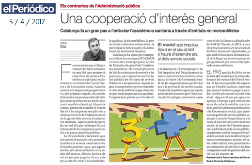 El president de la Taula del Tercer Sector, Oriol Illa publica aquest dijous l'article 'Una cooperació d'interès general' a El Periódico.. Illa ressalta quie "la Unió Europea estableix clarament que el serveis d’atenció a les persones (també els serveis sanitaris) són d’interès general, i que, per aquest motiu, no estan sotmesos a les regles del mercat. Alhora, faculta als Estats perquè puguin donar més pes a criteris com: l’accessibilitat, la qualitat, la disponibilitat, la protecció de col·lectius vulnerables, la participació dels usuaris o la innovació, en detriment del preu".