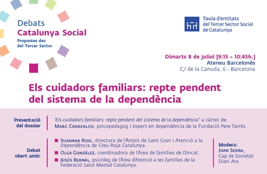 El proper dimarts 8 de juliol se celebrarà el Debat 'Catalunya Social' 'Els cuidadors familiars: repte pendent del sistema de la dependència'. La presentació del dossier que porta el mateix nom anirà a càrrec de Marc Cadafalch, psicopedagog i expert en dependència de la Fundació Pere Tarrés.