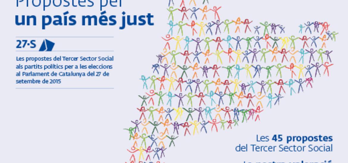 La Taula de entidades del Tercer Sector Social de Cataluña ha presentado el documento ‘Propuestas por un país justo’, que incluye 45 propuestas dirigidas en los partidos políticos en vistas a las elecciones en el Parlamento de Cataluña del próximo 27 de septiembre. El documento también incluye una valoración de la legIllatura 2012-2015 donde se plasman los principales adelantos, retrocesos y temas pendientes de la legIllatura anterior en los ámbitos de las políticas sociales (vivienda, ocupación, pobreza, infancia, discapacidad...) y de relaciones con el Tercer Sector.
